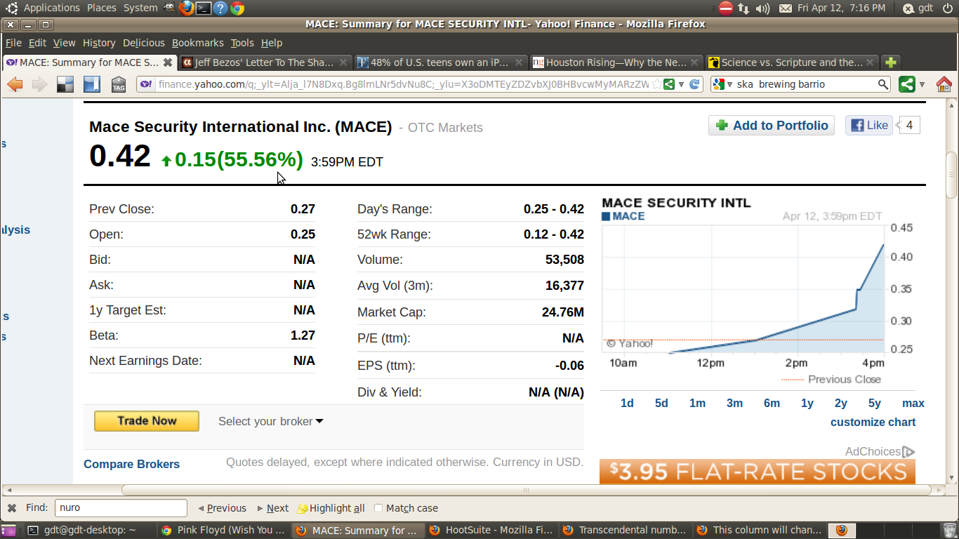 Two NSPH Pi moments today (02013.04.26): (1) I placed an order to sell some NSPH at $Pi. (2) At 7:09am MST NSPH was down Pi%.